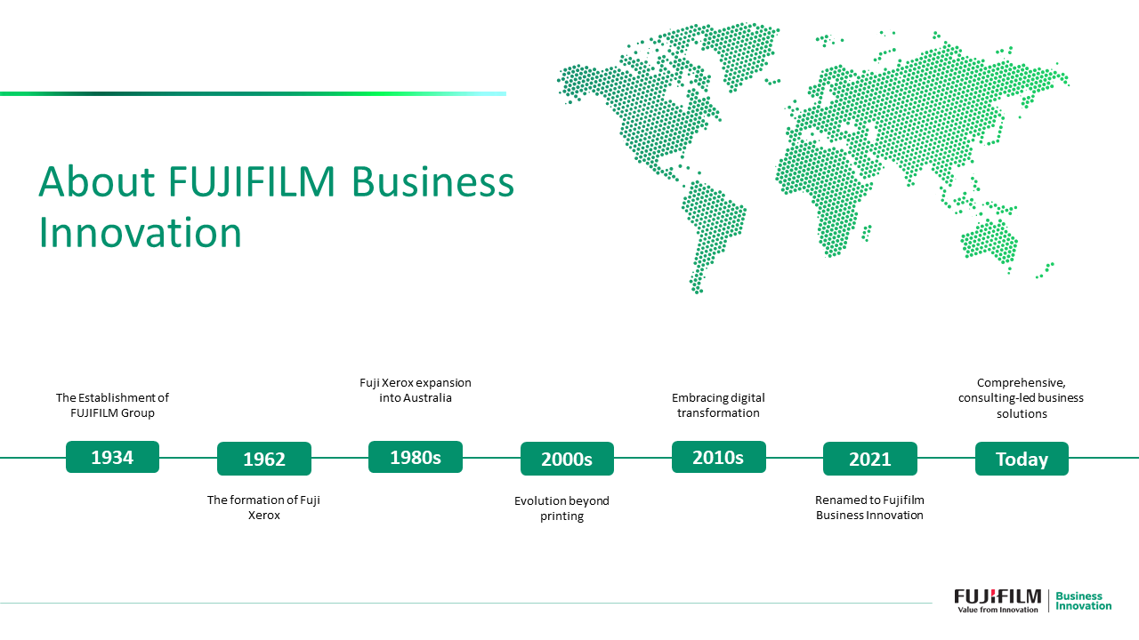 We’ve been operating in Australia since 1960 (formerly as Fuji Xerox Australia). Our legacy of world-class multifunction devices and document-related solutions has grown into delivering end-to-end digital transformation capabilities to support and scale your business to new heights.