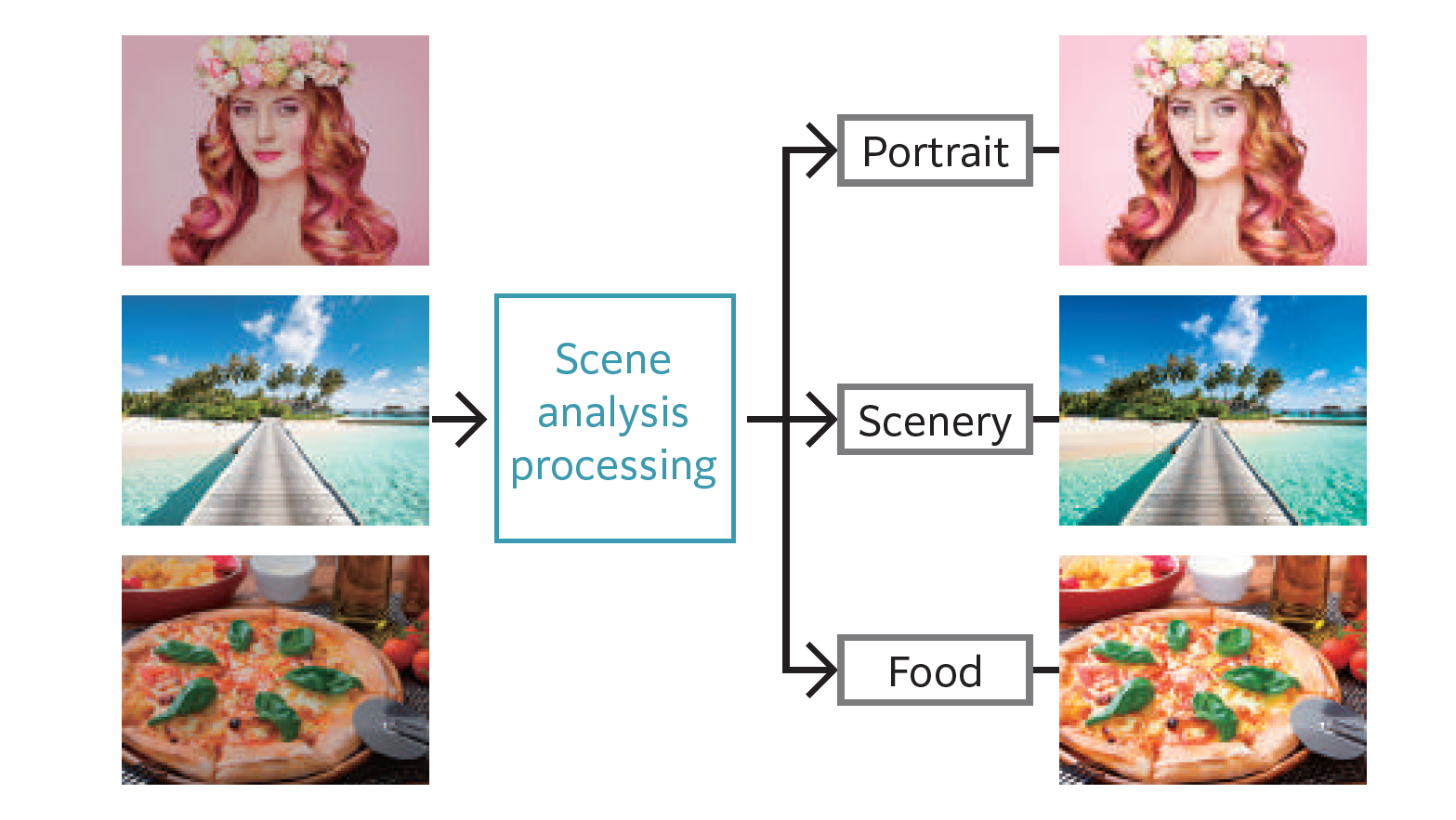 - RGB images, such as photos, are made even more beautiful by automatically*10 detecting if they are "Portrait" or "Scenery" and correcting them to match the characteristics