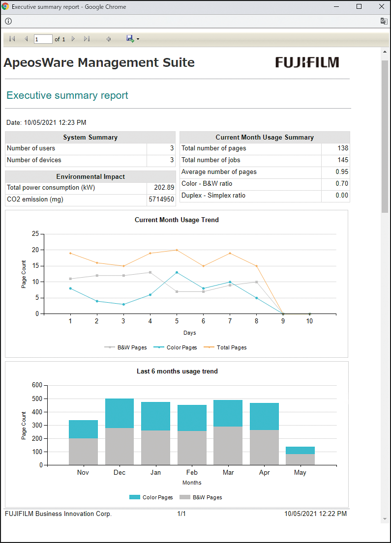 A wide-range of reports can be created on the web browser using collected job log information such as the users of devices, sheets that are output, paper sizes, and time. The report function has been dramatically enhanced in ApeosWare Management Suite 2. A variety of reports can be created across five categories.