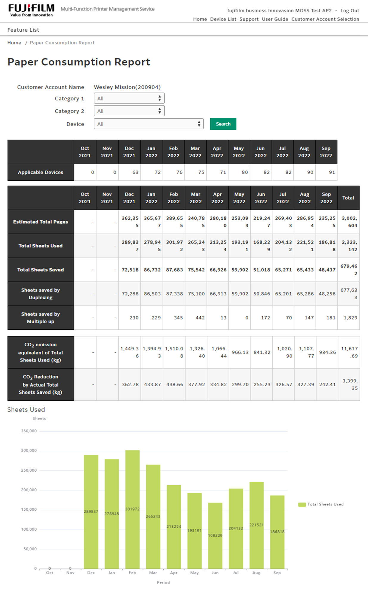 The number of sheets reduced by using functions such as 2 pages up or 4 pages up printing, and the corresponding reduction in CO2 emissions (estimated) can be confirmed. (By month, for the past year)