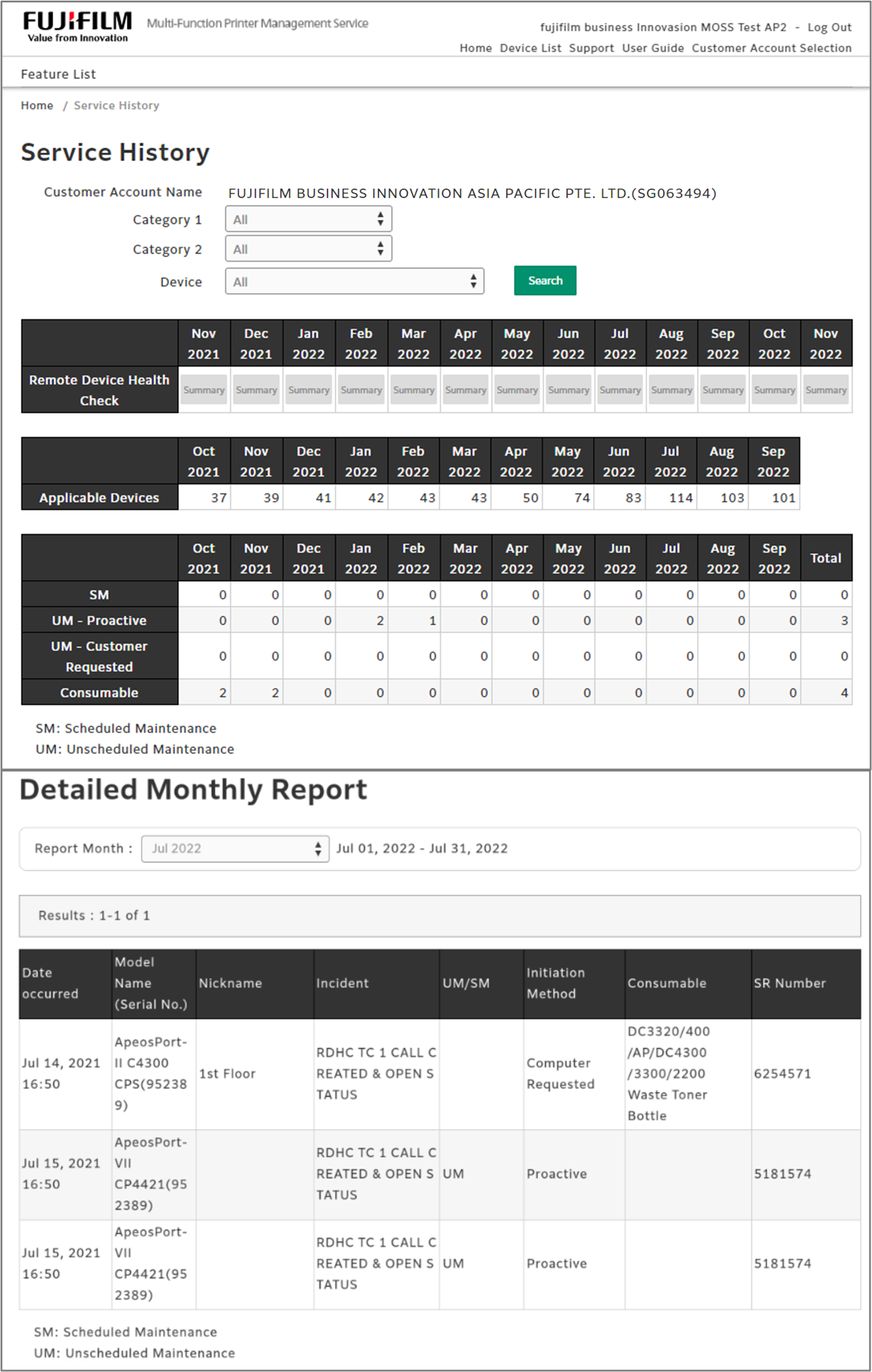 A list of the maintenance history (number of maintenance visits) can be confirmed per device. (By month, for the past year) You can also check the detailed maintenance history for each month.