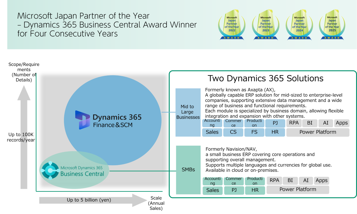 - ※1: Dynamics 365 is a suite of intelligent business applications provided on Microsoft’s cloud platform. We offer both Dynamics 365 Finance & SCM for enterprises and Dynamics 365 Business Central for small and medium-sized businesses, enabling us to serve a wide range of clients.