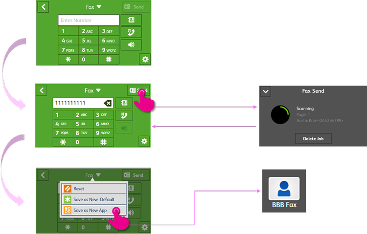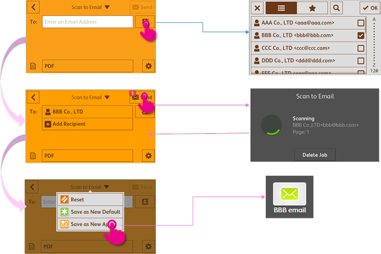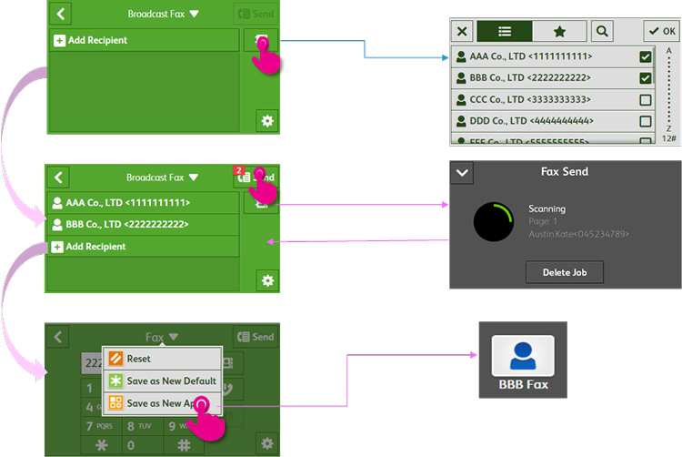 - Note3 Broadcast fax destination and scan to email destination are retained until you return to the Home screen to be registered in the address book or registered as a new application. (See Fax Address Registration (Broadcast Fax) andScan to Email Application Registration)