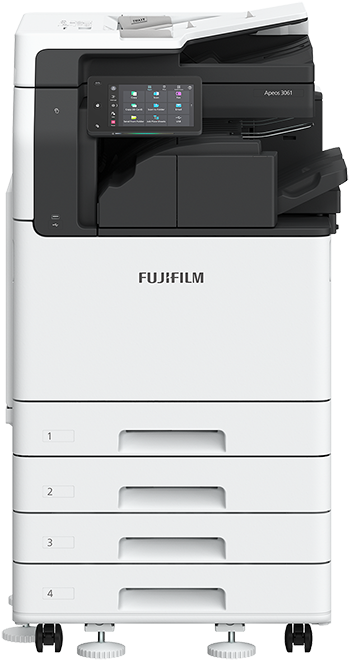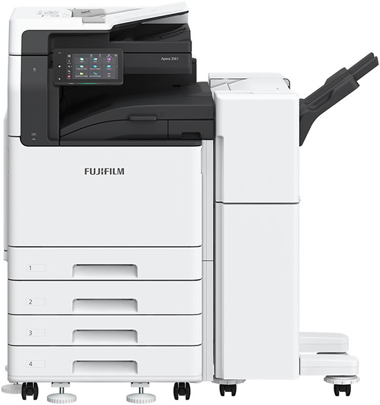 Apeos 3061 with optionsThe new series supports a broad range of media from as thin as 52 gsm to heavier paper up to 300 gsm, as well as long-size output up to 297 x 1,200 mm*4 - ideal for in-house production of promotional materials. Envelope and postcard printing - previously limited to the bypass tray on earlier models*5, can now be performed from the standard tray*6, enabling more efficient day-to-day printing. Internal paper handling noise has also been reduced compared to previous models*5 as a result of refined noise reduction technology. Specifically, the finisher*7, which can be installed to the inner output area, adopts a quiet design that suppresses collision and drive noise, reducing acoustic level by 60% as compared to the previous finisher*8 helping to maintain a comfortable office environment.