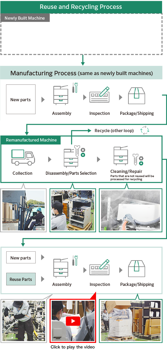 We extract parts from the machines collected from customers and by utilizing our unique reuse and recycle technologies to reuse them as parts for remanufactured product.