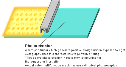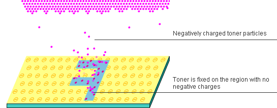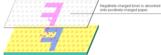 Positively-charged paper is brought close to the photoreceptor. By using the characteristic that positive charges attract negative charges, negatively-charged toner is absorbed onto paper.