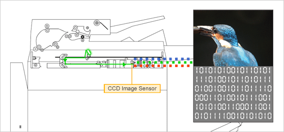 The image is scanned by irradiating white light onto the original document and guiding the reflected light to the CCD image sensor. Since the CCD image sensor is made of semiconductors having the property of converting intensities of lighting into electrical signals, the image of the original document is converted into digital data by use of this property.