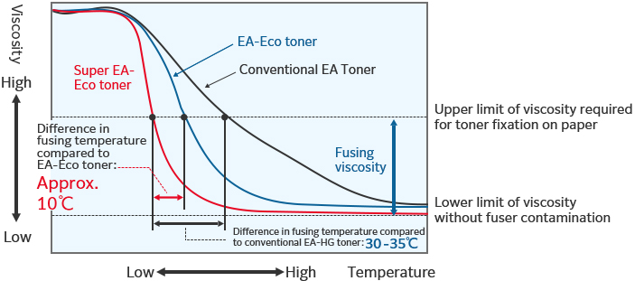 FUJIFILM Business Innovation’sEA-Eco toner, which has low-temperature fusing performance that is among the best in the world, has been evolved even further in order to develop our Super EA-Eco toner, which boasts a fusing temperature approximately 10℃ lower than that of EA-Eco toner. Fig. 1 shows changes in the viscosity of Super EA-Eco toner relative to temperature.