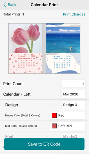 1)Open the " 7-Eleven Multicopy " app, select "Photograph Print," then choose "Calendar Print."2)Select the size and design, insert your photos, customize the theme and text colors, and tap "Save to QR Code".