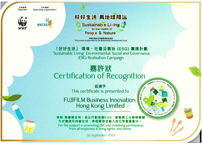 FUJIFILM Business Innovation Hong Kong has been recognized as "Hong Kong Green Organization" by the Environmental Campaign Committee. This certificate recognizes our high level of commitment in improving our environmental performance in different aspects.