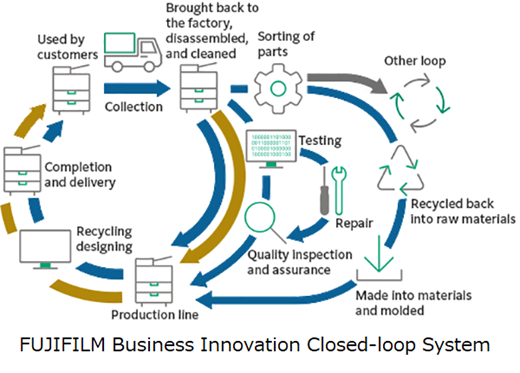 FUJIFILM Business Innovation established a company-wide recycling policy in 1995 and a circular production system examining the entire product lifecycle, from product planning, development, and manufacturing stages to disposal was introduced in the same year. Aiming to achieve infinite “zero landfill”, used products are collected, parts are selected, and reused through applying recycling technologies.