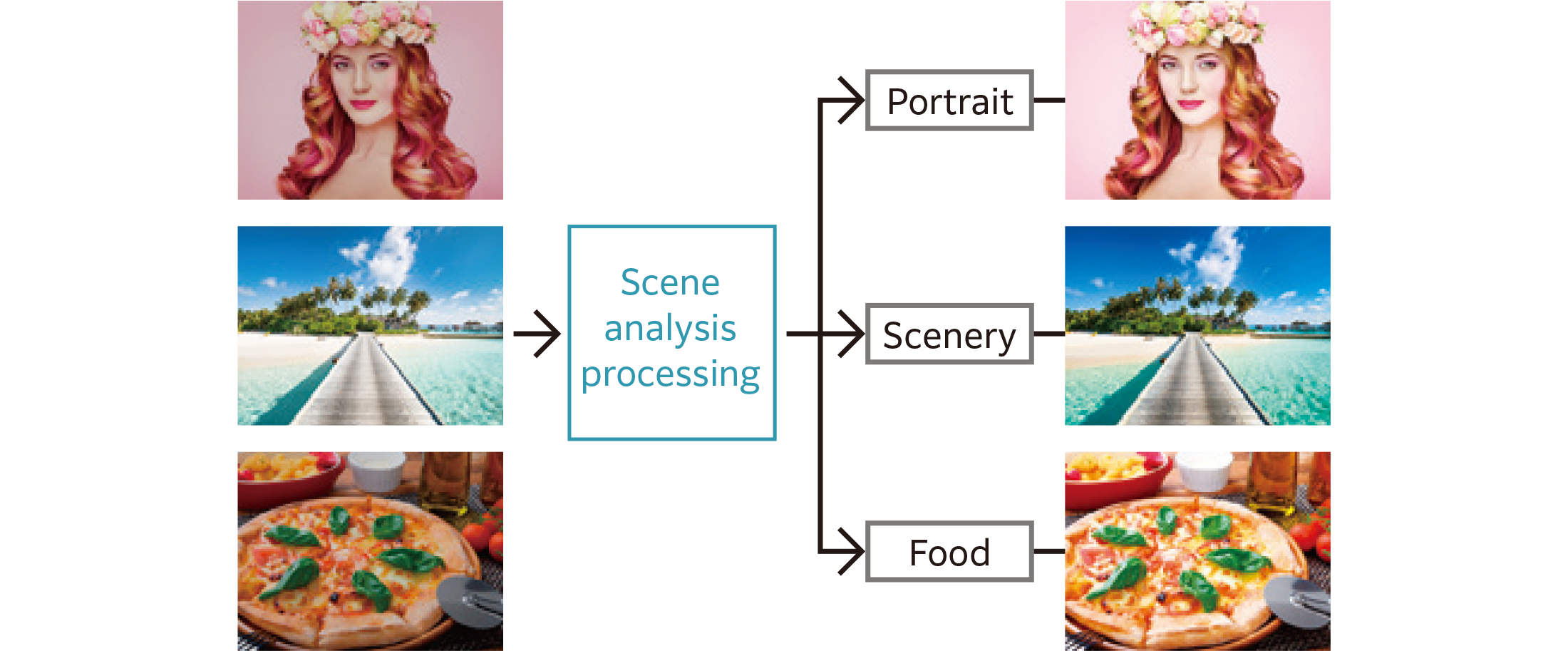 - RGB images, such as photos, are made even more beautiful by automatically* detecting if they are "Portrait" or "Scenery" and correcting them to match the characteristics