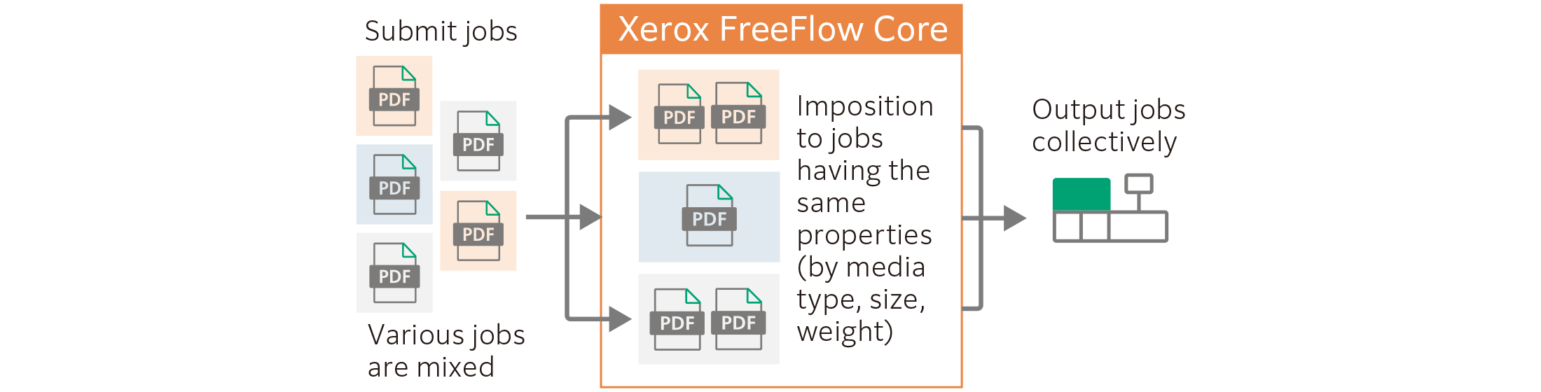 The efficiency of printing operation can be improved by grouping jobs having the same properties. It brings improved productivity and shorter turnaround with short-run printing of a wide variety of contents.