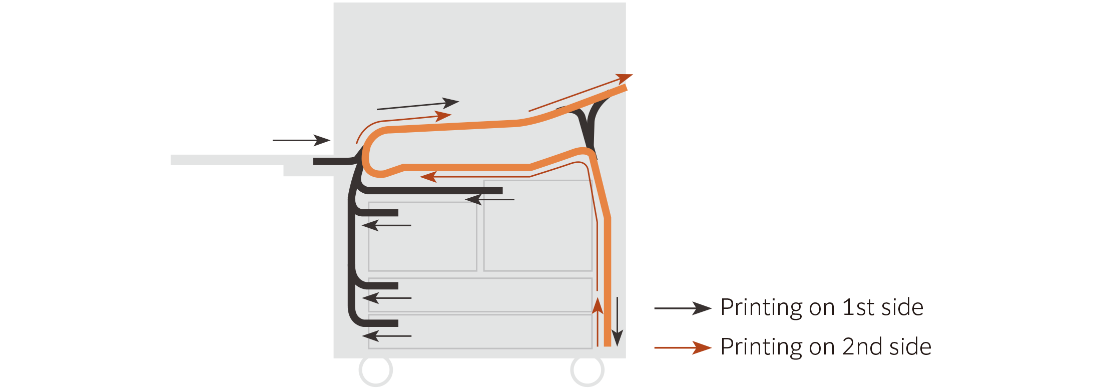 Wide turning angles in paper path provide stable and speedy paper transport. This device has a good resistance against paper jam by adopting vertical paper inversion mechanism for 2 sided printing to reduce curves in the paper path.