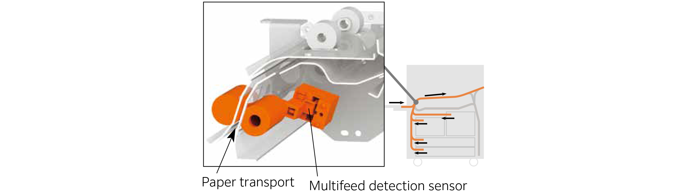 The multifeed detection sensor monitors the paper flow to prevent the feeding of multiple sheets of paper. If a multifeed is detected, printing is interrupted to prevent blank page insertion.