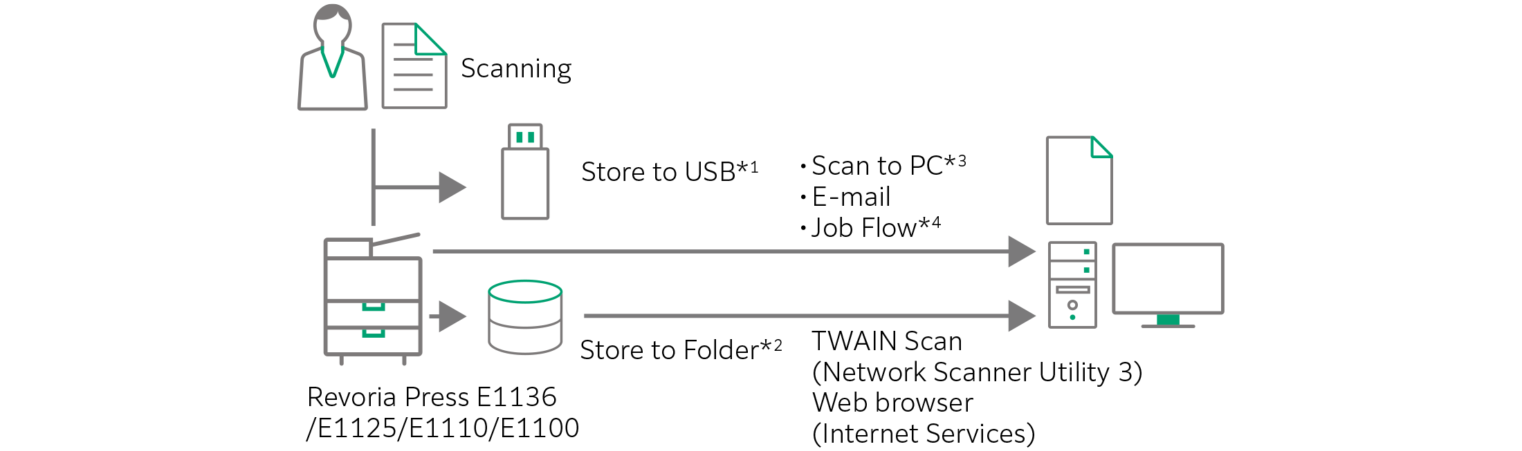 - *3: Scanned files are sent and stored to PC folders via FTP transfer or SMB.
