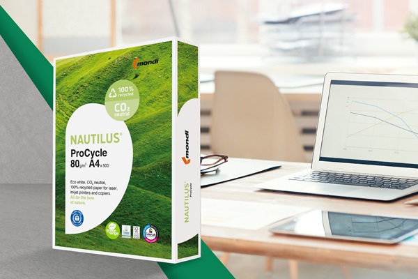 NAUTILUS® ProCycle is a new premium 100% recycled paper from Mondi supported by leading certifications, such as Blue Angel, FSC™ and EU Ecolabel. It is available in A4 and A3. ColorLok® printing technology enables vivid colours and deep blacks for laser, Inkjet copying and printing.