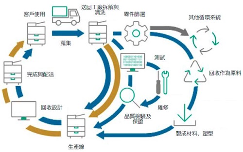 富士膠片商業創新於1995年制定了全公司的回收政策,並於同年推出一套循環生產系統,對整個產品生命週期進行查驗,包括產品規劃、開發、製造以至廢棄。本著實現無限「零廢堆填」的目標,該系統收集已使用產品、挑選零件,並應用回收技術進行再利用。