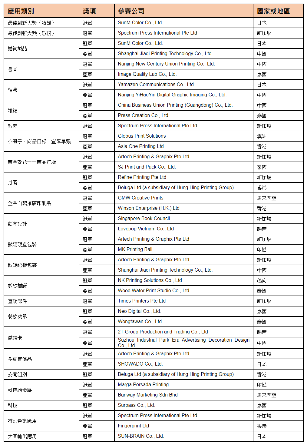 這獎項舉辦至今已經有16年,今年首次有兩位得獎者同時榮獲「最佳創新大獎」,得獎公司分別為噴墨技術和碳粉技術組別的冠軍。事實上,今年來自22個組別共39件得獎作品,均各自展現超凡的創意和卓越的打印質素。