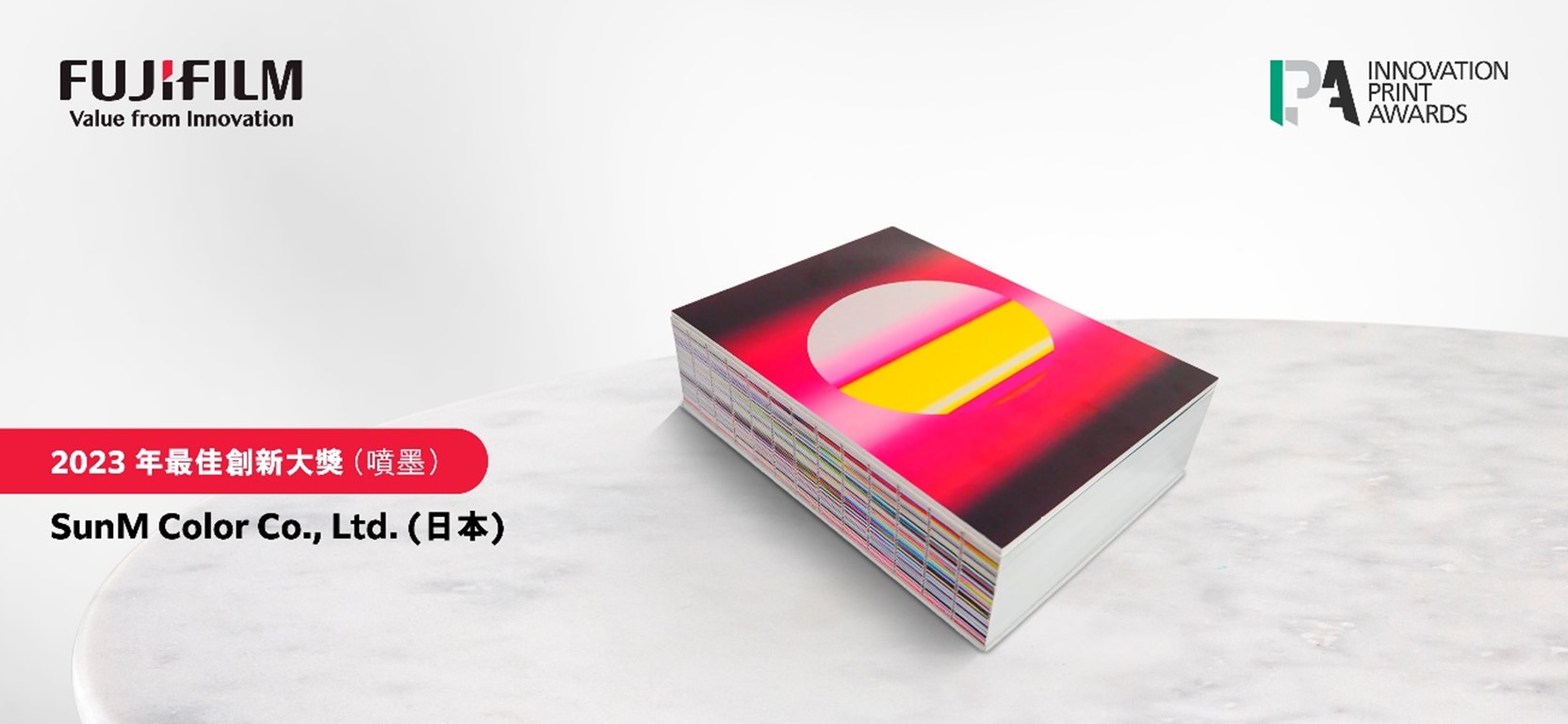 這項「最佳創新大獎(噴墨)」的得獎作品名為「SUN BOOK」,是一本限量印製的特殊書籍,堪稱「藝術書籍的奇蹟」。它的設計巧妙,除了毋須用手拿起都能保持打開狀態,還有精美的書口燙箔加工。該書由SunM Color Co., Ltd.利用Jet Press 750S噴墨打印機製成,印有365件藝術品及其製作日期。這項作品將色彩的層次和範圍全面放大,效果相對接近三原色(RGB)打印,即使運用一般的打印紙張,也能呈現鮮豔亮麗的噴墨打印效果。據SunM Color Co., Ltd.表示,只有數碼打印技術才能支援是次製作,包括12種顏色的封面且限量365本。獲獎的「SUN」藝術作品是一個既獨特又大膽的項目,展露了設計師YOSHIROTTEN對大量媒介和技巧的駕馭能力。