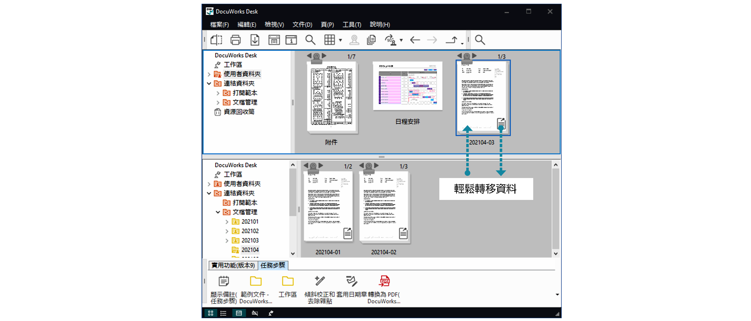 DocuWorks Desk的畫面可上下分割顯示,例如劃分存檔位置與作業空間,輕鬆完成文件的移動或儲存。