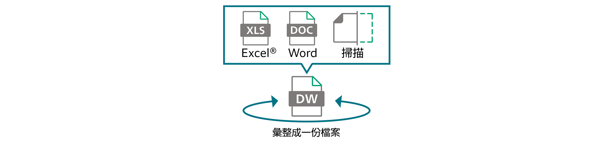 不同檔案格式的電子文件或已掃描的文件,轉換成DocuWorks文件後,即可整合一份檔案集中管理。