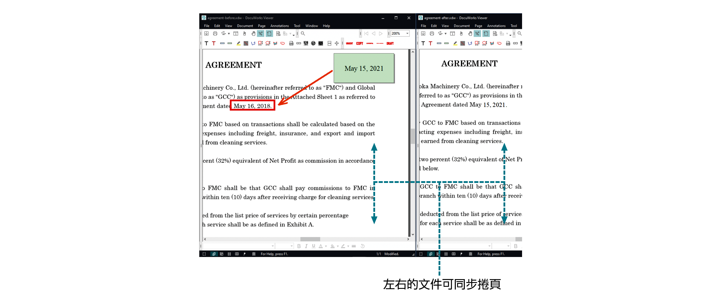可同時操作二份DocuWorks文件,左右的文件可同時捲頁,方便確認修正的部份。
