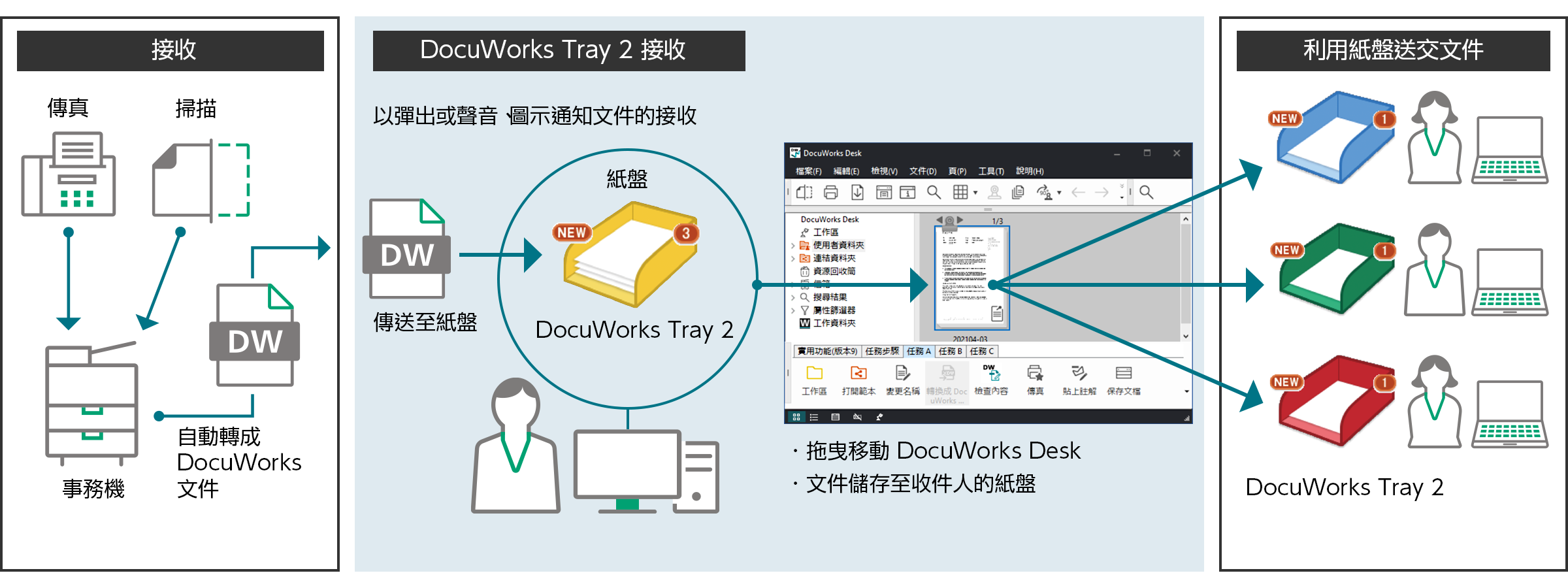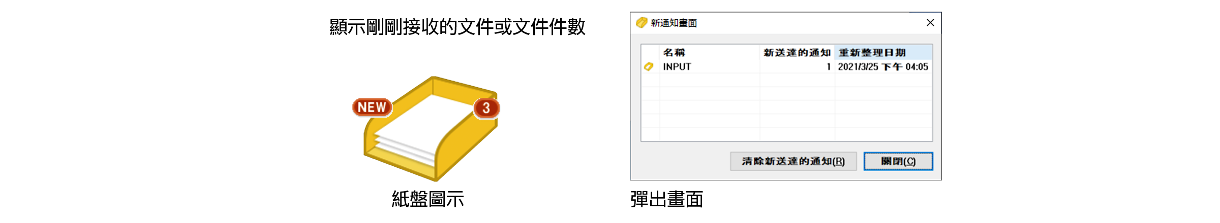 PC環境重現運用紙盤交接紙本文件。以圖示或彈出畫面等通知剛剛接收的文件,不會有不慎疏忽的情形。