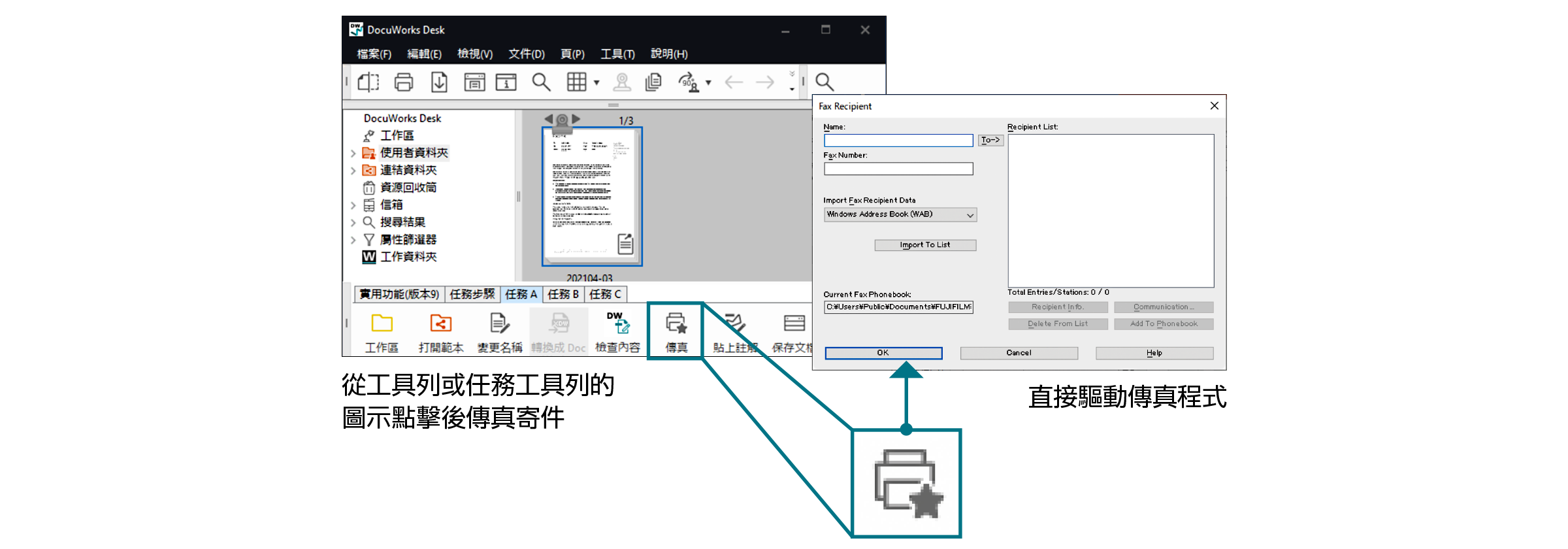 可從DocuWorks Desk直接傳真寄件。不用費事走到複合機,也不需要為傳真寄件而印出傳真文件,有助於減少使用紙張。