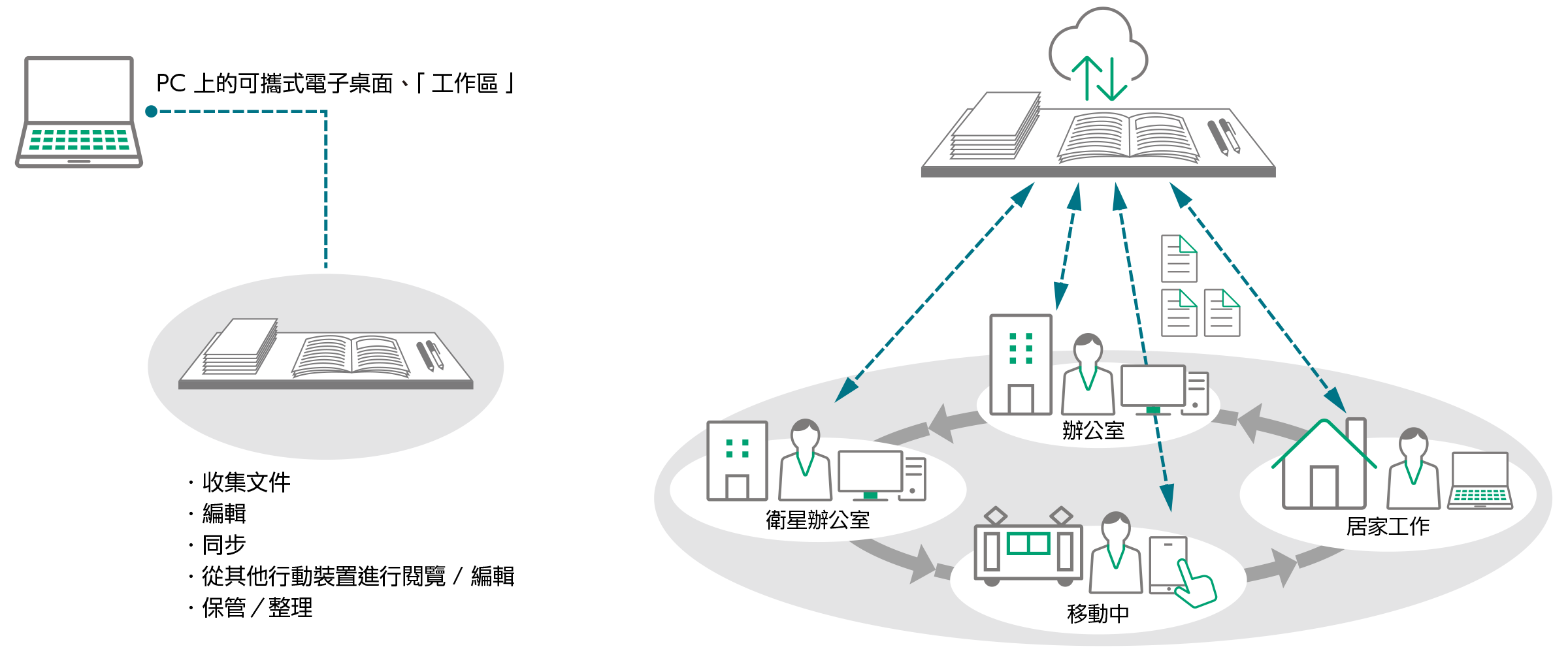 - 就像是自己專屬的可攜式電子桌面「工作區」,除了可透過雲端或網路等順暢地收集需要的文件之外,亦可透過手機於移動路途中或家裡不間斷作業。