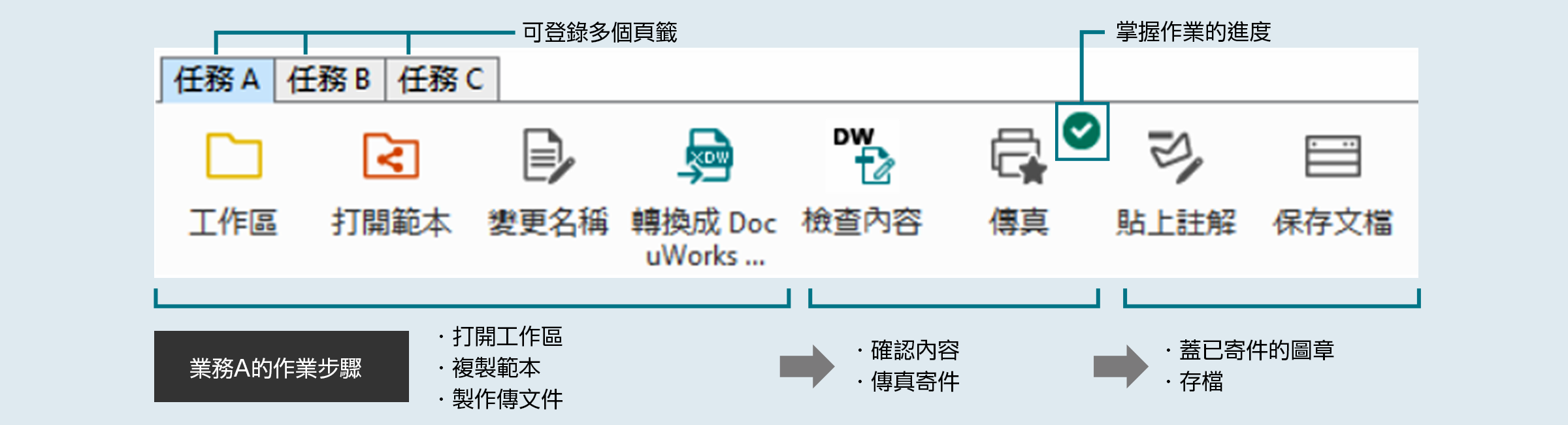 - 可自定義的「任務工具列」,製作多個頁籤,共享文件操作流程設定,促進團隊合作。