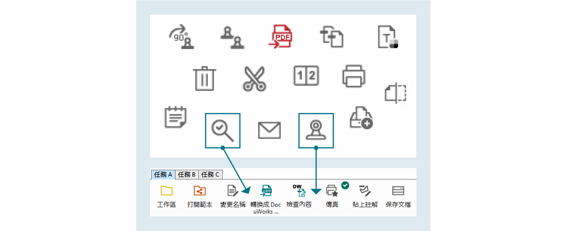 工具列客製化之後,可配置在DocuWorks Desk的畫面下方,登錄常用功能或作業步驟,可使業務更高效。