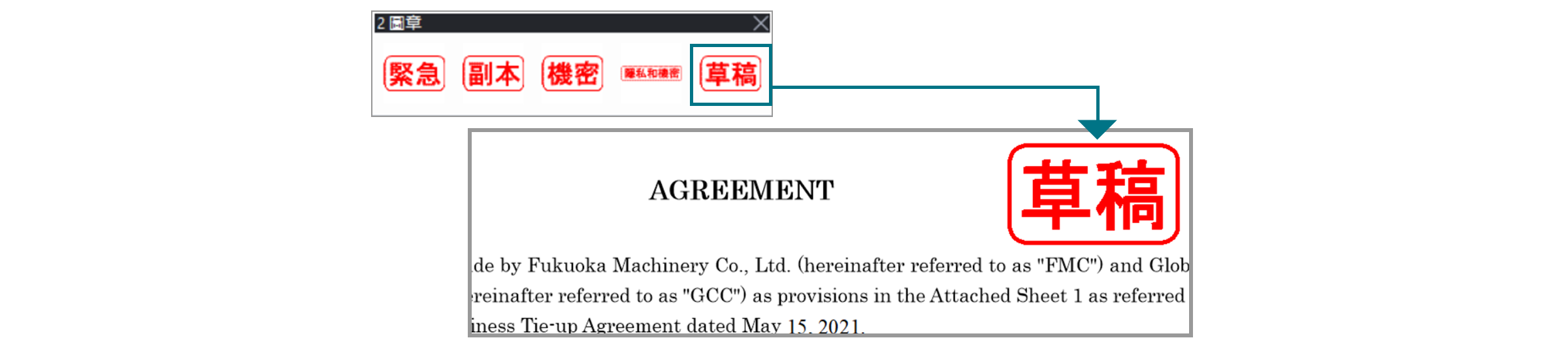除了標準配備日期章或「重要」、「緊急」、「核准」、「機密」等的圖章之外,亦可登錄獨創的圖章。此外,例如以蓋在預先決定的位置登錄至任務工具列,點擊任務工具列的圖示,即可輕鬆的蓋章。