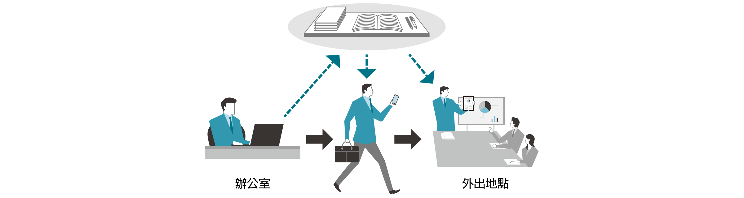 可從手機、行動裝置或其他的PC運用*平時在職場上使用的DocuWorks環境;亦可在外出地點或在家隨時使用DocuWorks Desk立即投入工作。