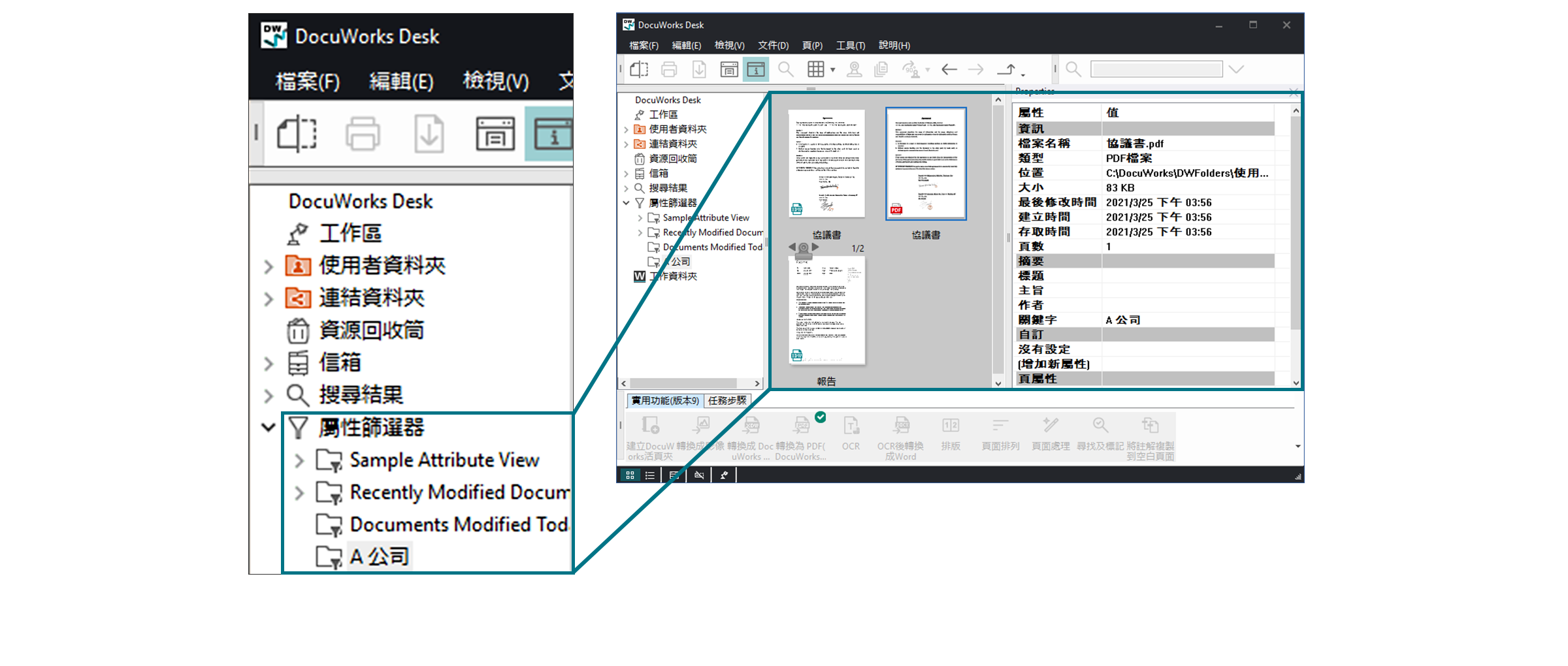 使用屬性視圖,賦予屬性的DocuWorks文件或PDF可從大量的檔案中篩選後顯示在工作區。