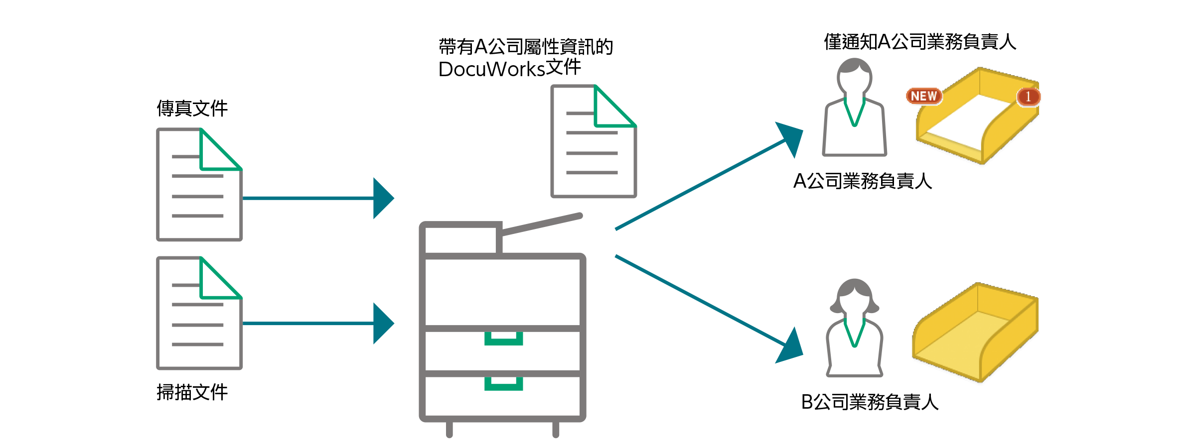可在複合機上將傳真收信文件或所掃描紙本文件轉換為DocuWorks文件,並透過Tray接收。此外,僅有登記屬性的文件可對Tray進行通知*,例如:來自A公司的傳真受信文件僅通知A公司業務負責人,透過此運用將可促使無紙化及分類作業更有效率。