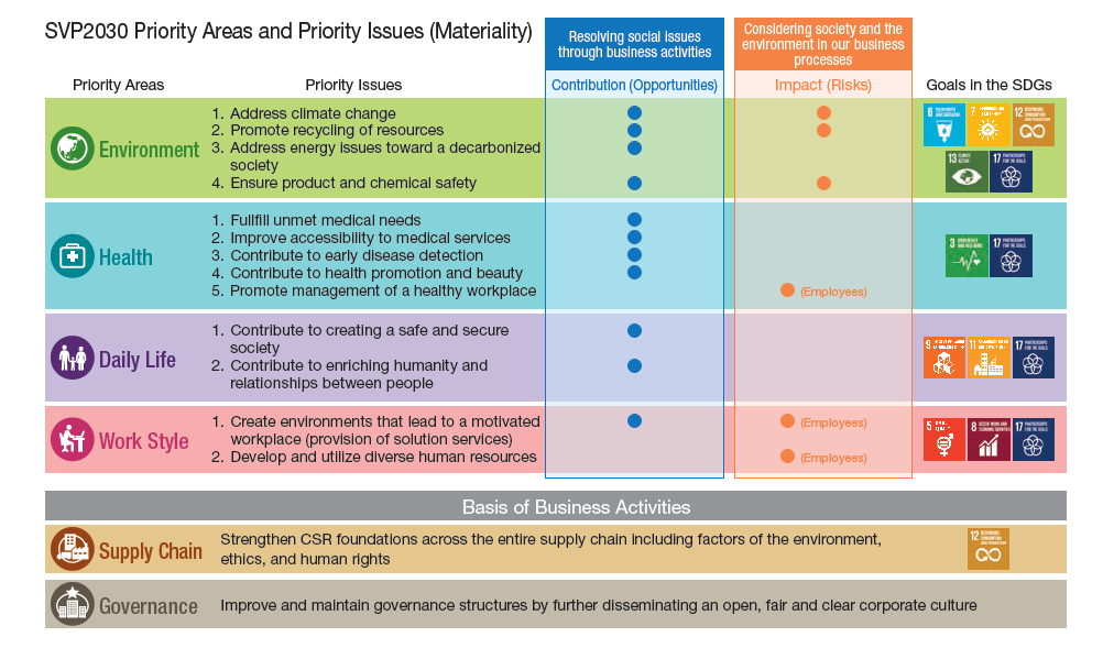 후지필름그룹은 지속적으로 발전해 나가기 위한 경영의 근간을 이루는 계획으로, 2030년도를 목표로 하는 CSR계획 "Sustainable Value Plan 2030(SVP2030)"을 계획하고 있습니다. 이 계획에 따라 혁신적 기술·제품·서비스의 제공 등에 의한 사업활동을 통해 사회과제의 해결에 적극적으로 대처하고 지속가능한 사회의 실현에 더욱 기여하는 기업을 목표로 하고 있습니다.