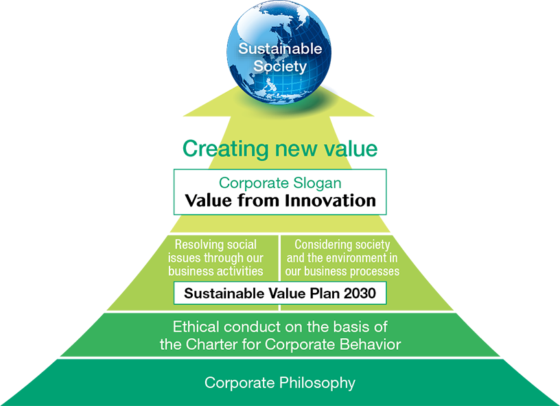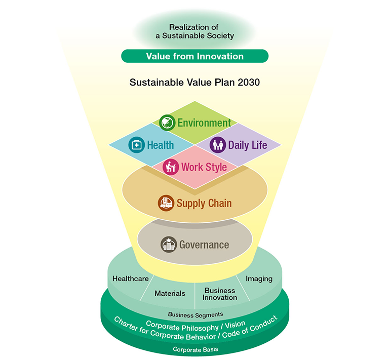 후지필름그룹은 지속적으로 발전해 나가기 위한 경영의 근간을 이루는 계획으로, 2030년도를 목표로 하는 CSR계획 "Sustainable Value Plan 2030(SVP2030)"을 계획하고 있습니다. 이 계획에 따라 혁신적 기술·제품·서비스의 제공 등에 의한 사업활동을 통해 사회과제의 해결에 적극적으로 대처하고 지속가능한 사회의 실현에 더욱 기여하는 기업을 목표로 하고 있습니다.