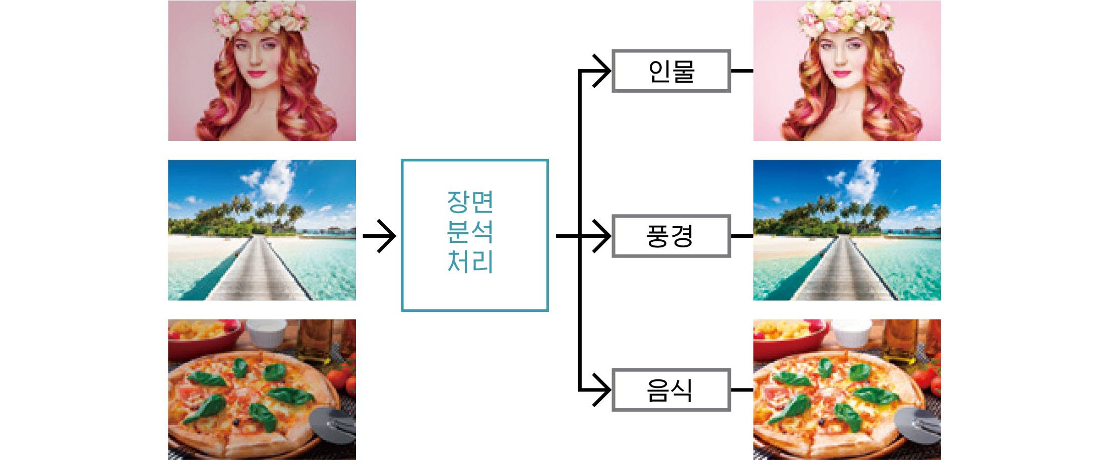 - RGB 이미지(예: 사진)를 자동으로*10 ‘인물’ 또는 ‘풍경’으로 인식한 후, 각각의 특성에 맞춰 보정하여 더욱 아름답게 표현