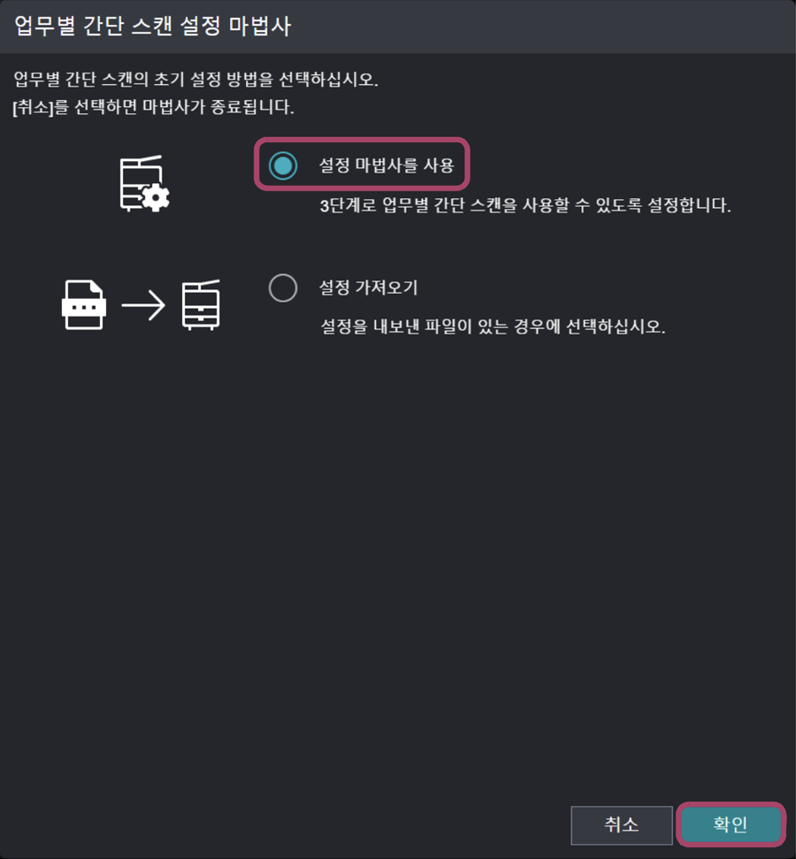 관리자는 스캔 딜리버리 Light 설정 마법사를 사용하여 초기 설정을 다음과 같은 3단계로 손쉽게 완료할 수 있습니다.