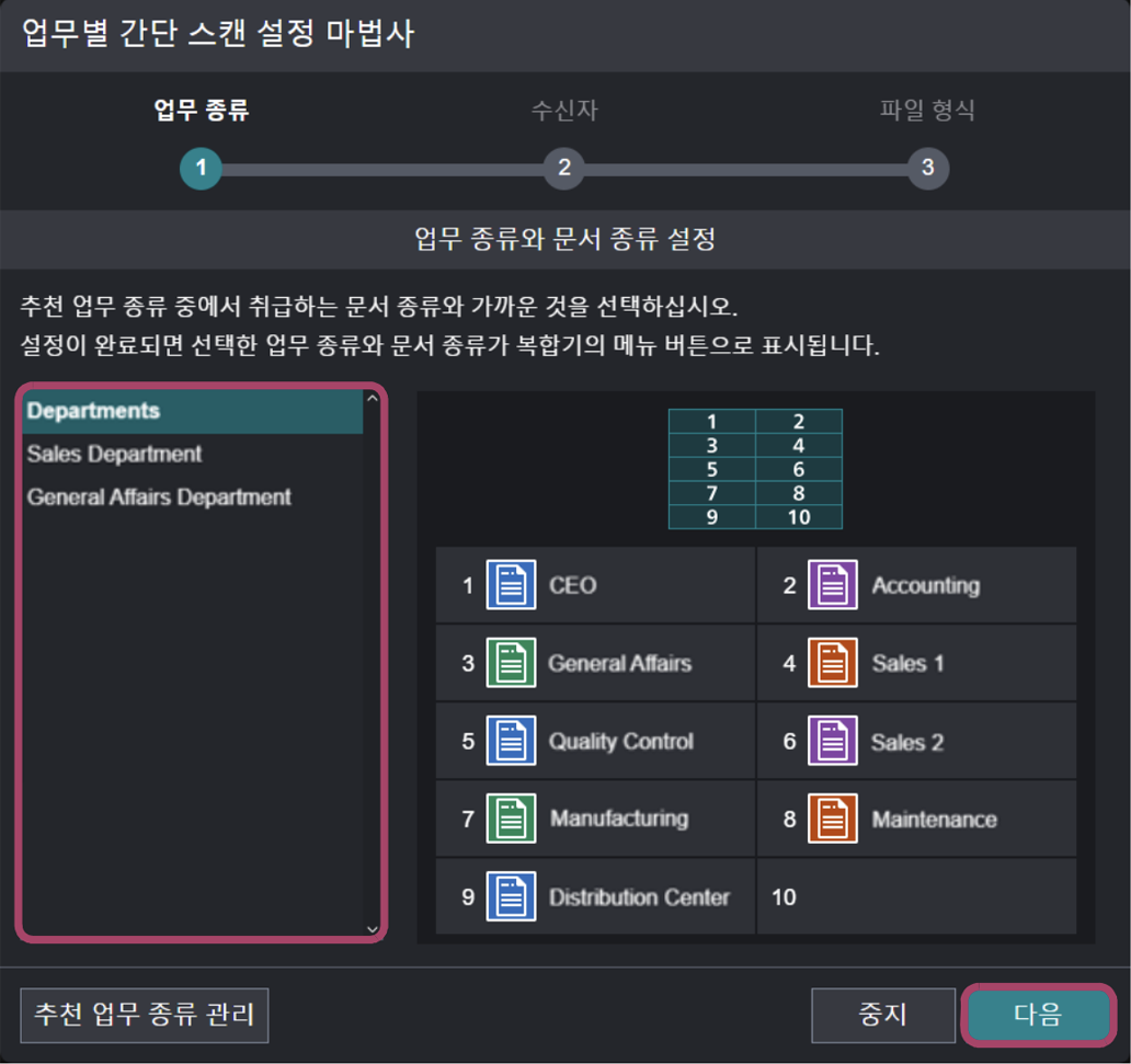 권장 업무종류는 설정 마법사에서 선택할 수 있습니다. '부서', '영업부', '총무부' 등 세 가지 종류의 추천 서비스 중에서 처리할 문서 종류와 비슷한 것을 선택합니다.