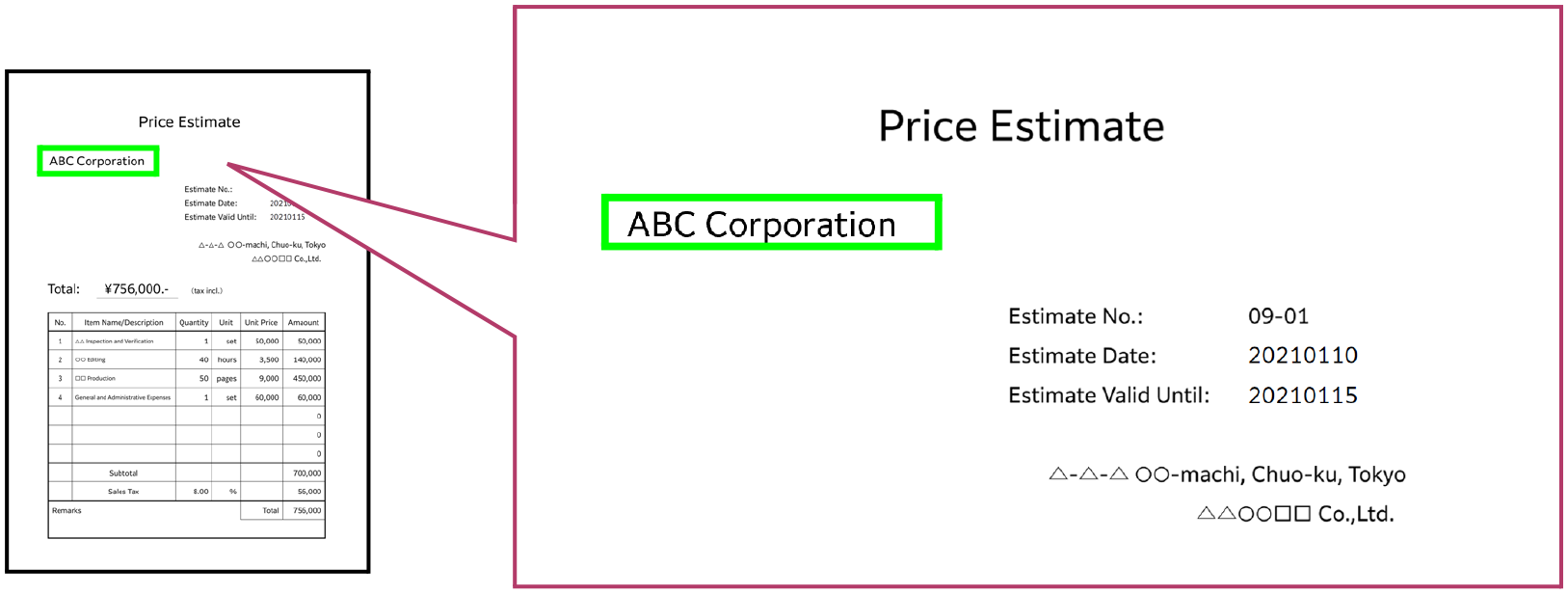 견적서 또는 청구서 이외의 표준 양식이 있는 경우 표시된 영역 내에서 문자열을 추출할 수 있습니다. 자동으로 추출된 문자열은 스캔한 문서의 파일 이름이나 저장된 폴더 이름에 사용될 수 있습니다.
