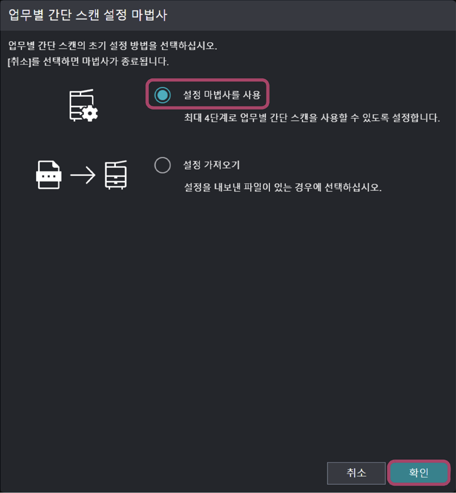 관리자는 스캔 딜리버리 설정 마법사를 사용하여 초기 설정을 다음과 같은 3단계로 손쉽게 완료할 수 있습니다.