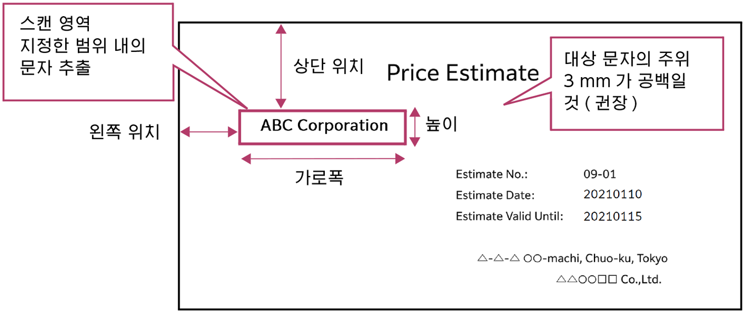 원고 왼쪽상단 위치에서 0~500 mm, 폭 / 높이를 2~500 mm 범위로 스캔 영역을 지정합니다 . 문자열의 일부가 지정된 영역에 포함되어 있으면 문자열이 자동으로 추출됩니다.