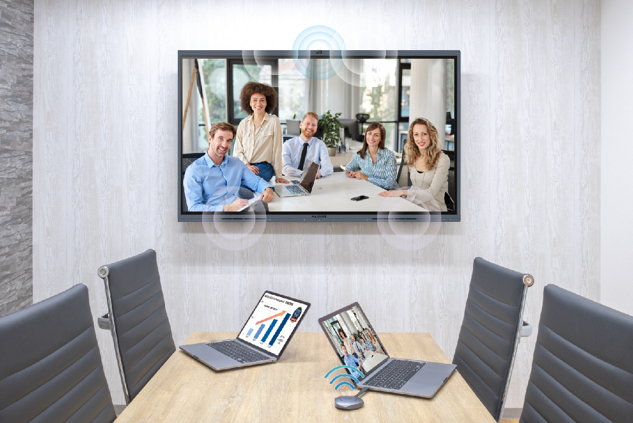 디바이스에 무선 동글을 연결하고 원클릭만으로 빠른 화면 공유와 함께, MAXHUB의 카메라・마이크・스피커를 활용하여 바로 회의가 가능합니다. 또한, 보안 프로토콜의 탑재로 기업 환경에 적합한 안전한 접속이 가능합니다.