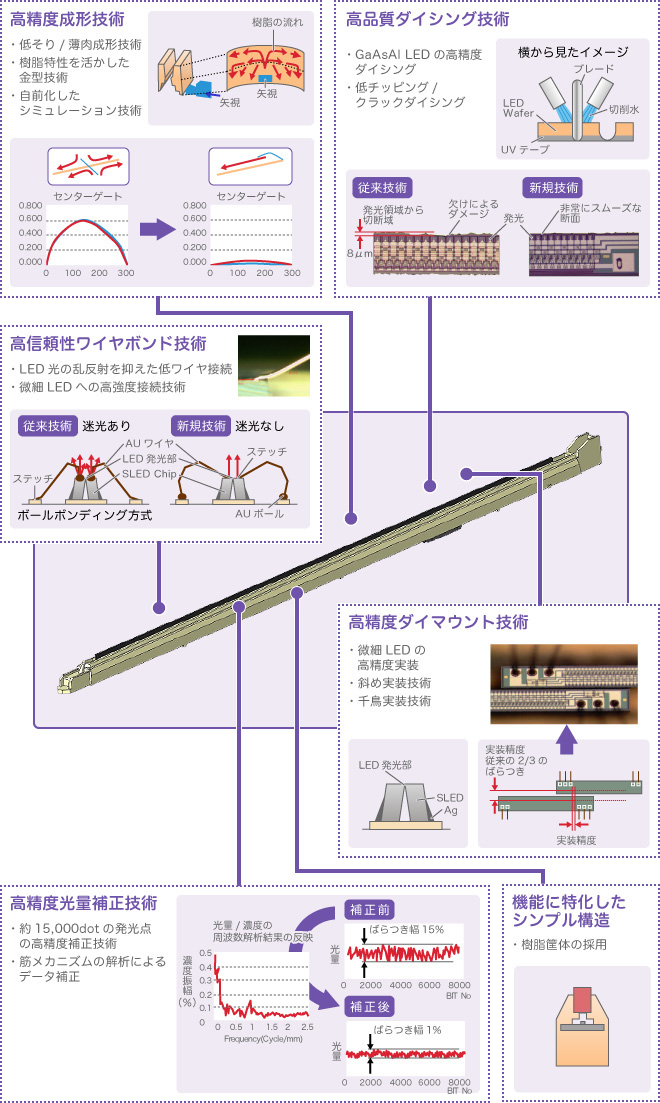 LEDプリントヘッドとは、小さなLED(発光ダイオード)を多数配列して光源とし、感光体に画像イメージを書き込むための装置です。