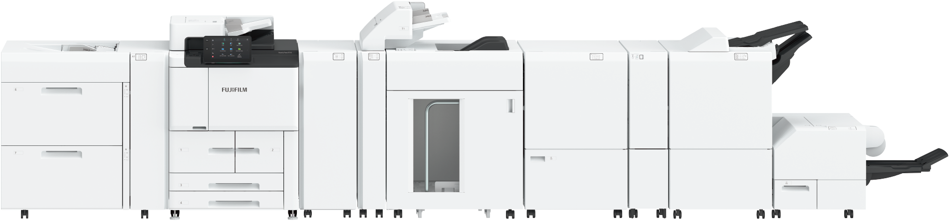 - A versatile in-line post-processing lineup is available for task such as paper folding, saddle stitching, three-way trimming, and saddle stitching with square back finishing.