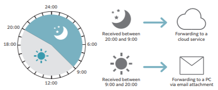 Received fax documents can be automatically sorted and forwarded without printing. Folders are automatically generated based on the sender's fax number, the received date, and the user linked to the sender. This eliminates the need for tedious sorting and organizing of received documents.Operations and forwarding destinations can be switched based on the time of day or day of the week to suit your work style.Furthermore, you will not miss important faxes sent to the office, even after working hours or while out, by receiving notifications via email or forwarding them to a cloud service.