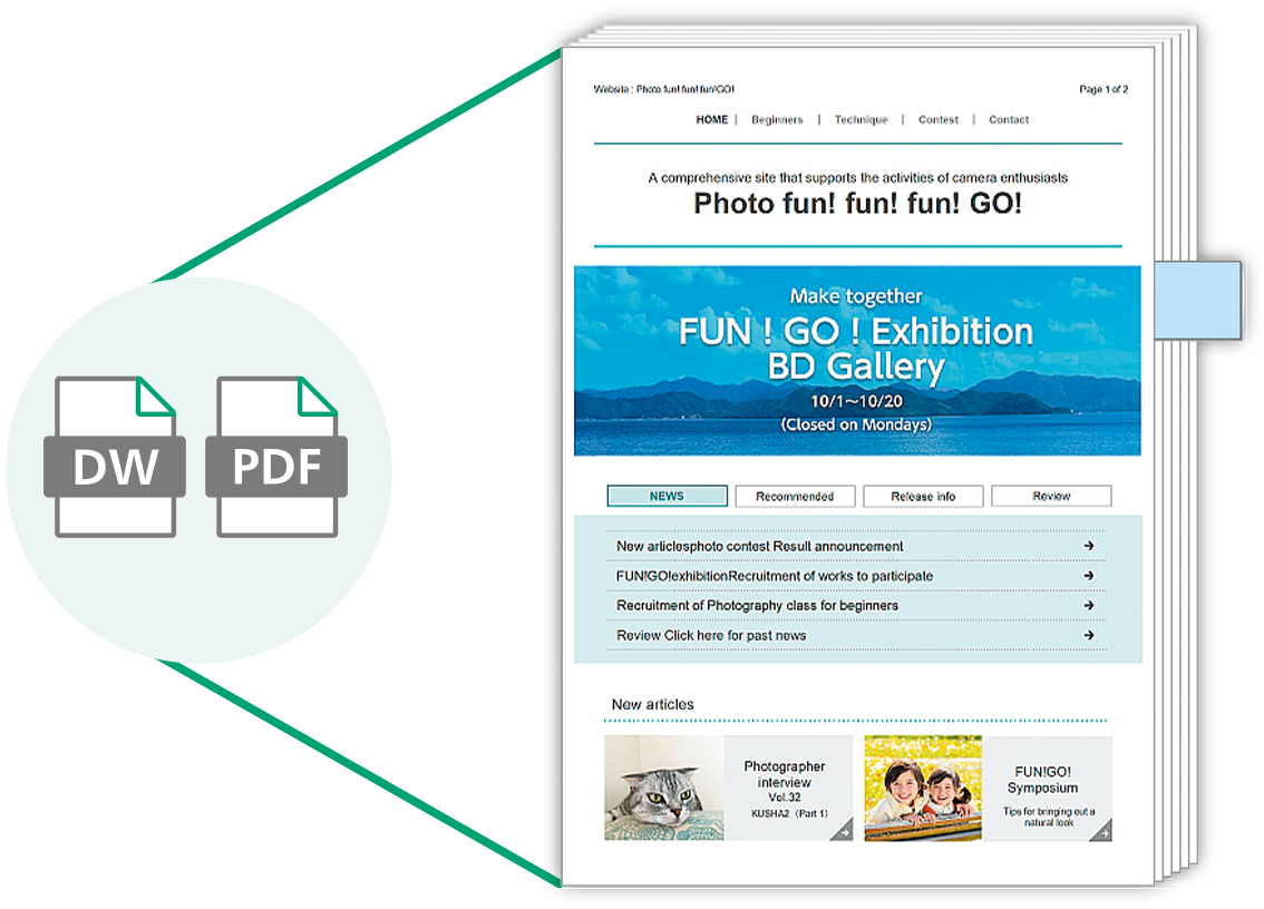 Microsoft Office documents such as Excel, Word, PowerPoint, and scanned documents can be easily convertedto DocuWorks documents or PDF using drag-and-drop.