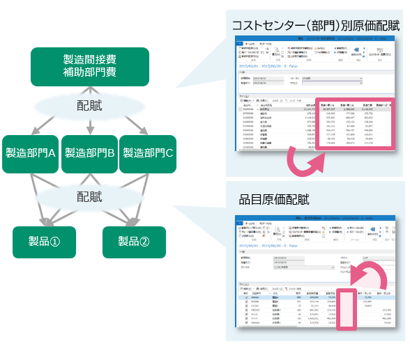 月内に発生した製造費用を勘定科目別にコストセンターに配賦し、さらに製造実績比率(時間または数量)で品目の単位原価に配賦する機能